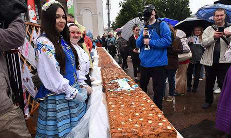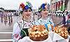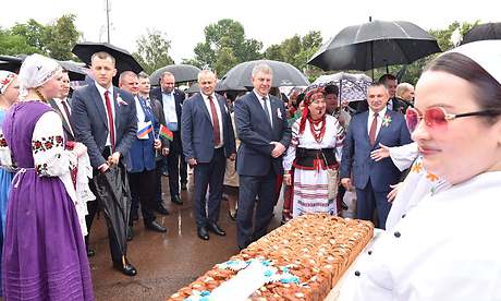Город мастеров встретил почетных гостей традиционным караваем и 80-метровым славянским пирогом — его испекли брянские и гомельские хлебопеки как символ юбилея Великой Победы, единства и дружбы славянских народов.