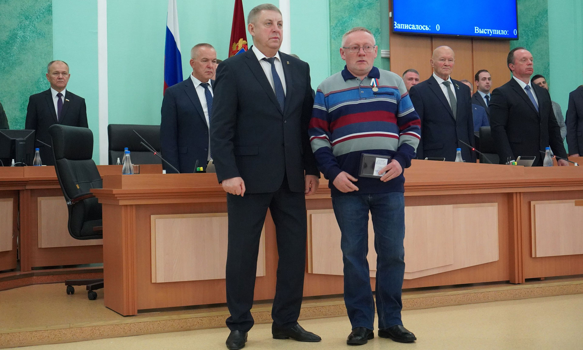 Перед обсуждением основной повестки заседания Александр Богомаз вручил родным Героев государственные награды. За мужество, отвагу и самоотверженность, проявленные при исполнении воинского долга, орденом Мужества посмертно награждены Александр Сергеевич Байдак, Александр Александрович Зубарь, Николай Михайлович Король, Илья Александрович Сиваков, медалью «За храбрость» II степени — Игорь Владимирович Пронин.
