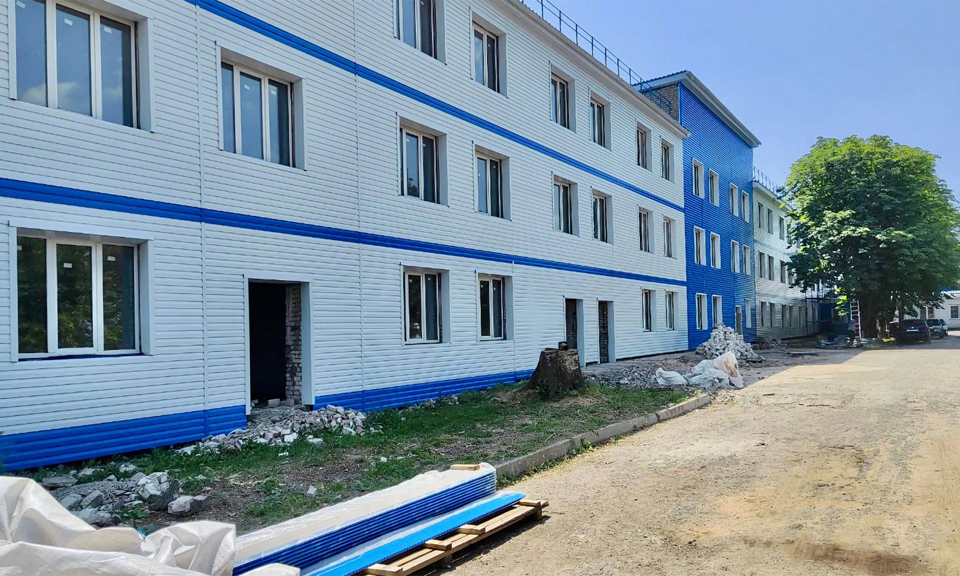 Инфекционная больница, которая не работала, это было разрушенное здание. Все, что здесь остается от прежнего здания,- это стены. Сейчас уже завершены работы по капитальному ремонту кровли над тремя зданиями: детских поликлиники и больницы, а также будущего инфекционного отделения. Также уже произведена замена оконных блоков и отделка откосов, продолжаются работы по монтажу вентилируемого фасада. В инфекционном отделении ведутся работы по заливке полов, приступили к монтажу перегородок.